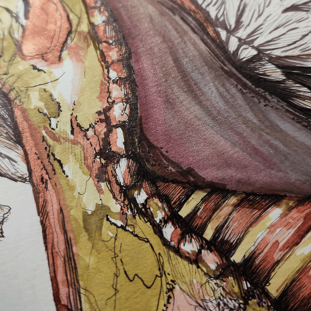 Dessin à l’encre noire et sépia, aquarelle et aquarelle métallique, crayon de couleur, posca et gaufrage