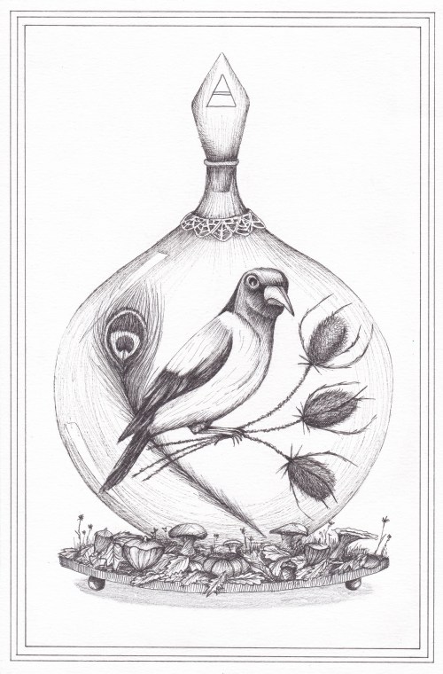 Les symboles sur les bouchons sont les symboles alchimistes de ces 4 aspects. Cette série fait référence à l’œuvre de Frederik Ruysch, médecin et anatomiste néerlandais du XVIIe siècle. Je vous invite à aller voir ses œuvres et sa biographie.